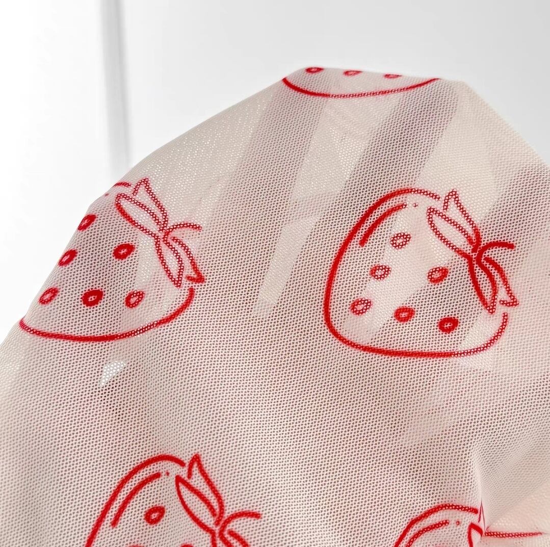 いちご柄が全体にプリントされた、通気性抜群のメッシュロンパース。